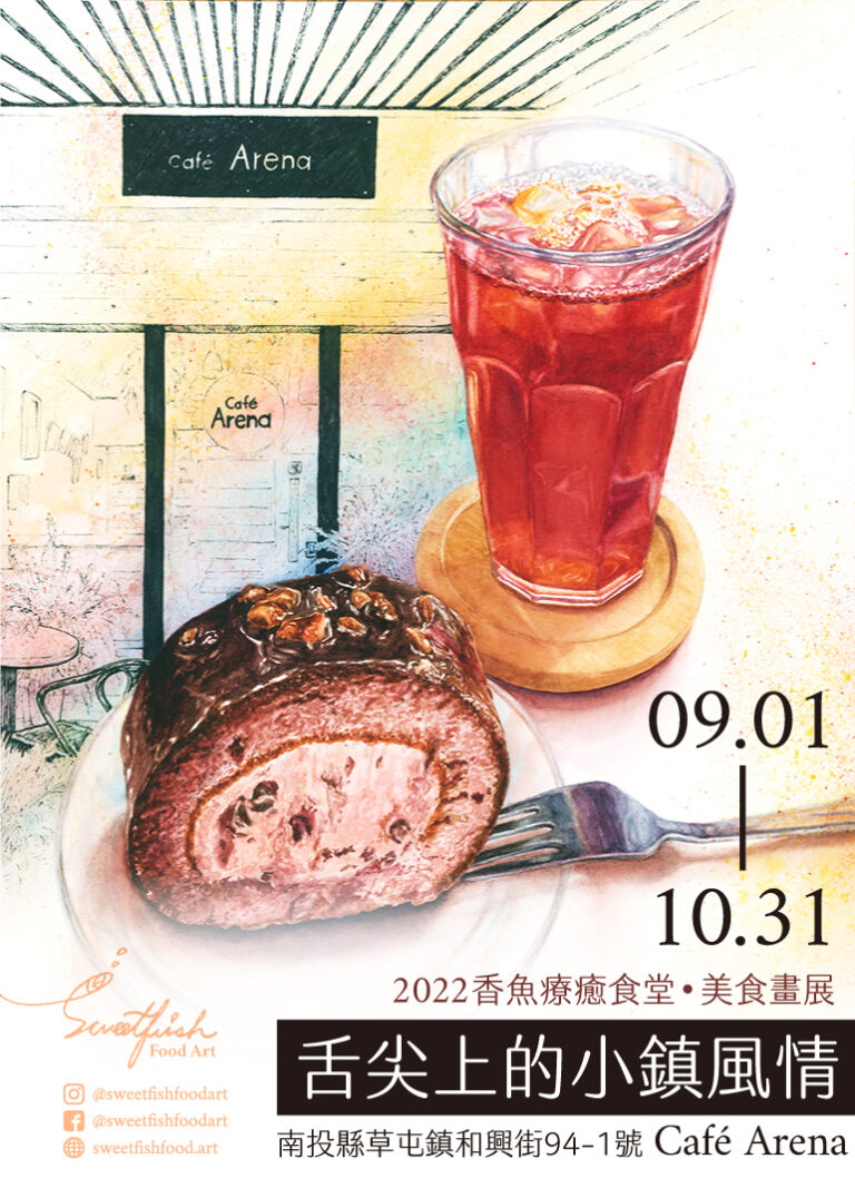 2016年,香魚發現了隱蔽在草屯市區小巷內的咖啡館- Cafe Arena。第一次造訪即對他們美味的咖啡和甜點印象深刻,之後便再訪了數次。店主 Lucius 不但對咖啡充滿熱忱,尤其相當親切健談;他看過香魚當時的作品,就邀請香魚來 Cafe Arena 辦展覽。店內展示作品的方式十分講究,有專門吊掛畫作的設備,店主對每期展覽的作品都用心、積極地在線上推廣,並向來訪的顧客詳細介紹。因此即使當時香魚還在上班,作品的數量和水準都仍無法展覽,卻已暗自決定有一天要在 Cafe Arena 辦個人展覽。經過6年後,香魚終於在今年9-10月於 Cafe Arena 舉辦了第二場個人展覽-舌尖上的小鎮風情。