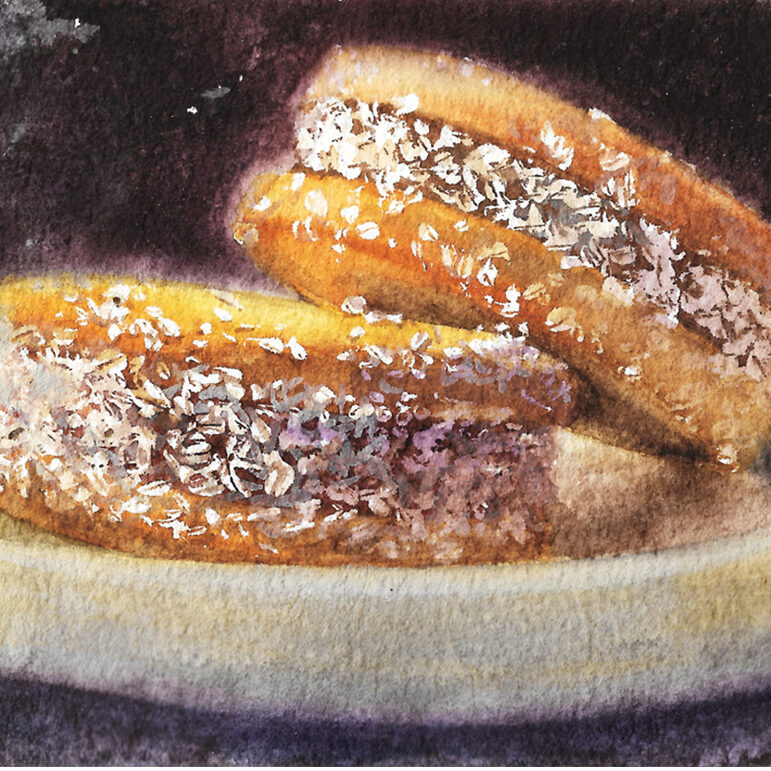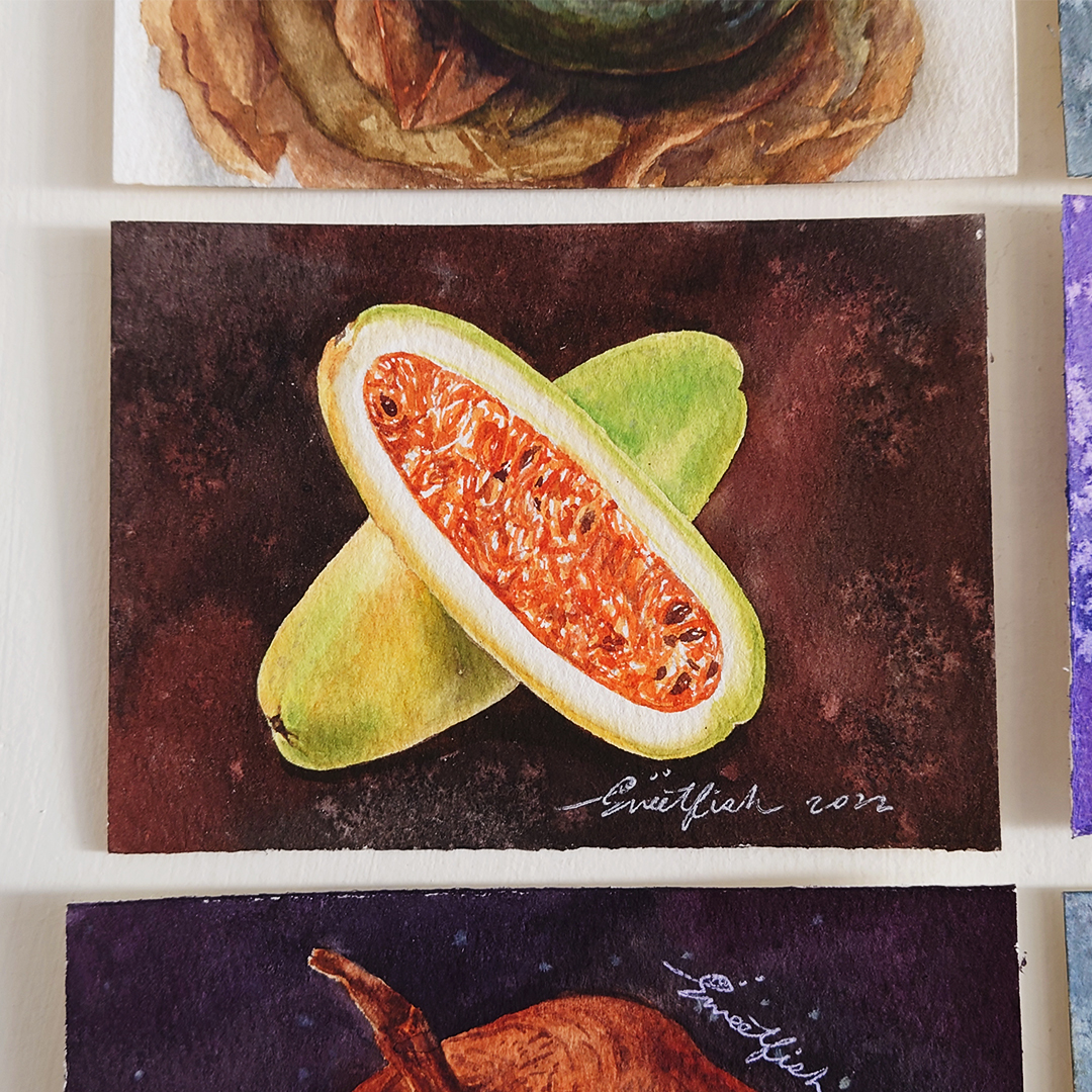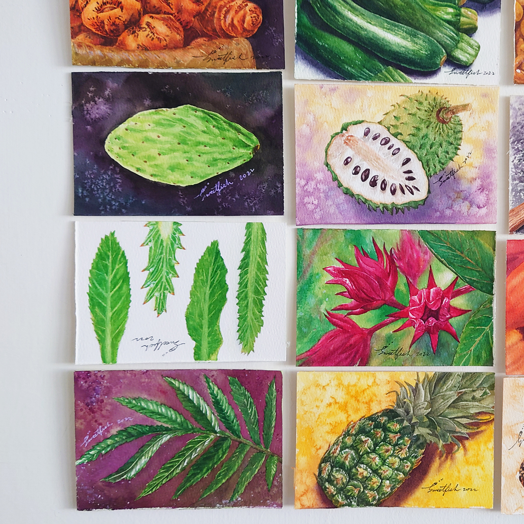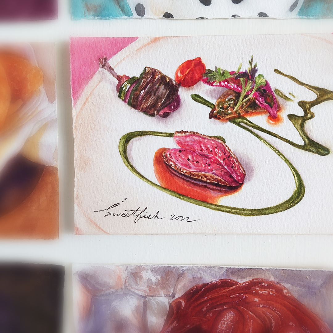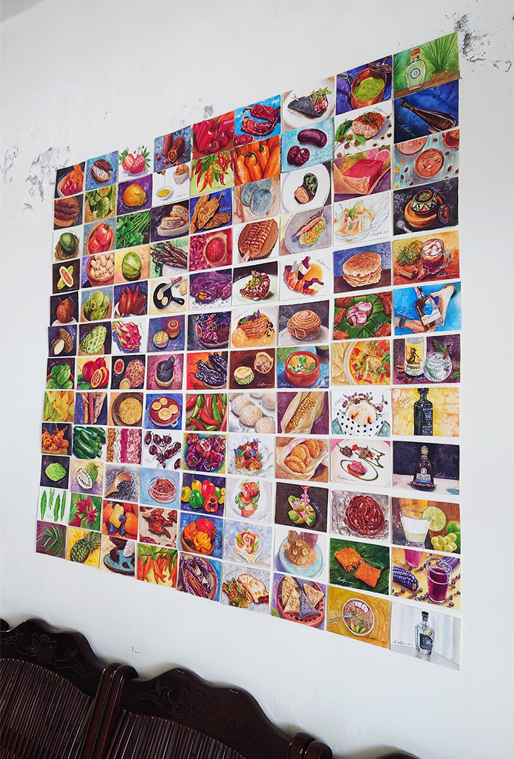 作畫過程中,認識了許多奇特的拉丁美洲食材,像是長得像被奇異筆畫上圖案的根莖類Mashua,或是台灣也有卻極為少見的香蕉百香果Banana passionfruit;以及猜不透是什麼滋味、和鮪魚同名的水果Tuna,和從來沒想過可以做成料理的胭脂仙人掌Nopel等。邊畫邊覺得好有趣,真想嘗嘗這些食材是什麼滋味啊!而MONO主廚的料理本身就像藝術品,繪製的過程就是一種享受;看起來不僅美味,還令人讚嘆整體的美感。然而飲食之美包含色、香、味、聲音和質地等,還是要親臨現場才能全面感受。住在香港或是有機會去香港的朋友,不妨親自去體驗一下。
