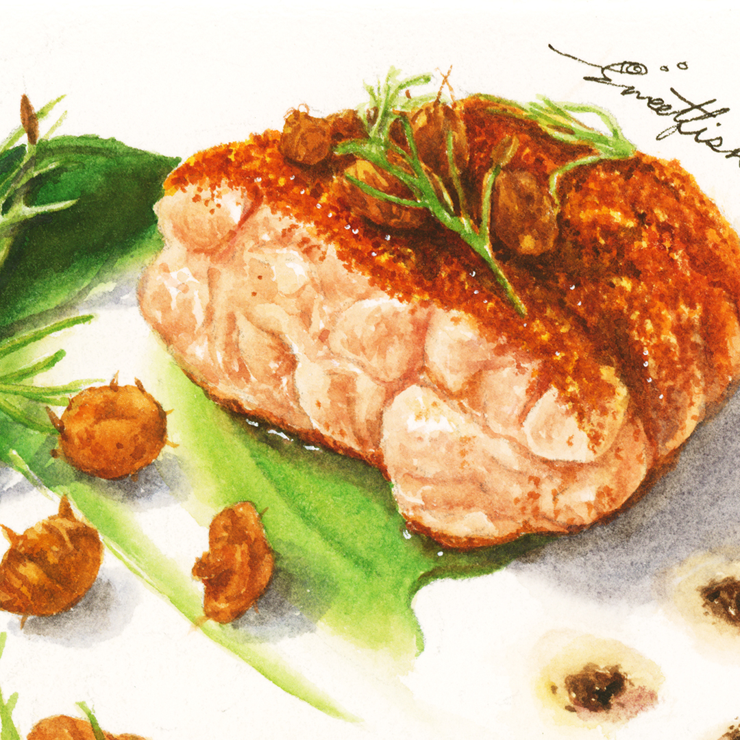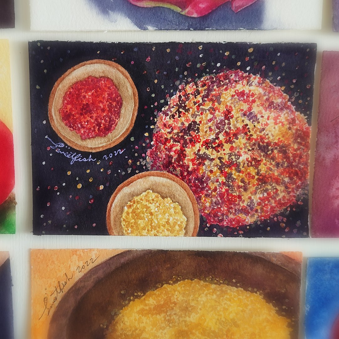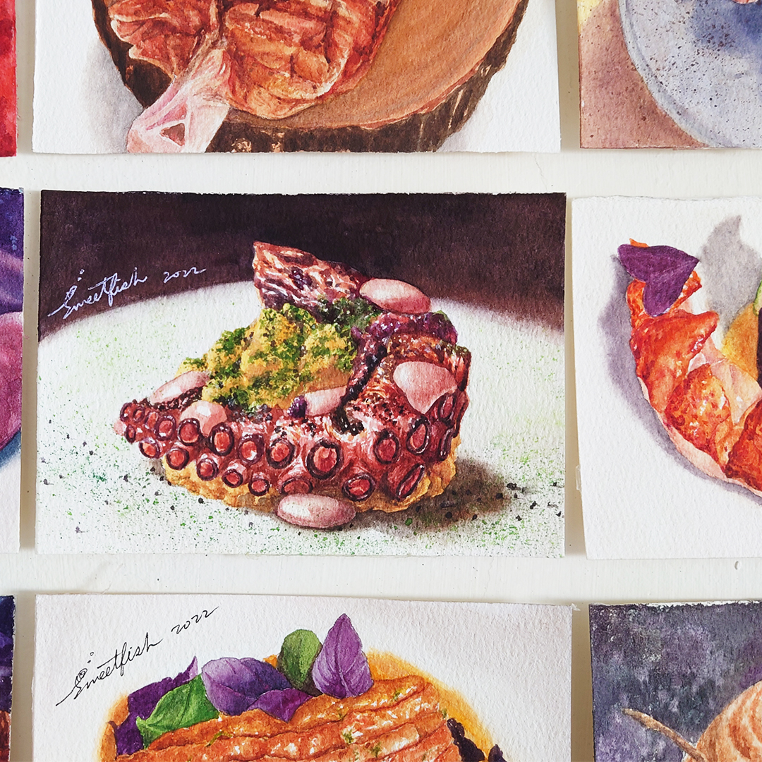 2022年底接到了香港佳民餐飲集團Jia Group的行銷公司聯繫,詢問是否能幫旗下的法式餐廳MONO即將出版的手冊作畫,內容是介紹餐廳特有的食材、菜餚、酒類和器材等等。搜尋了MONO的相關資料,得知MONO的主廚Ricardo Chaneton是拉丁美洲裔,曾經擔任過法國米其林三星餐廳的主廚;他將自己對拉丁美洲的鄉土情懷融入法式料理,創作出充滿特色的米其林式菜餚。能為這樣精緻的餐廳美食作畫令香魚感到十分興奮,同時也因一個月內必須趕出將近110件作品而感到壓力重重。有趣卻也十分有挑戰性,沒猶豫多久就接下了這件案子。