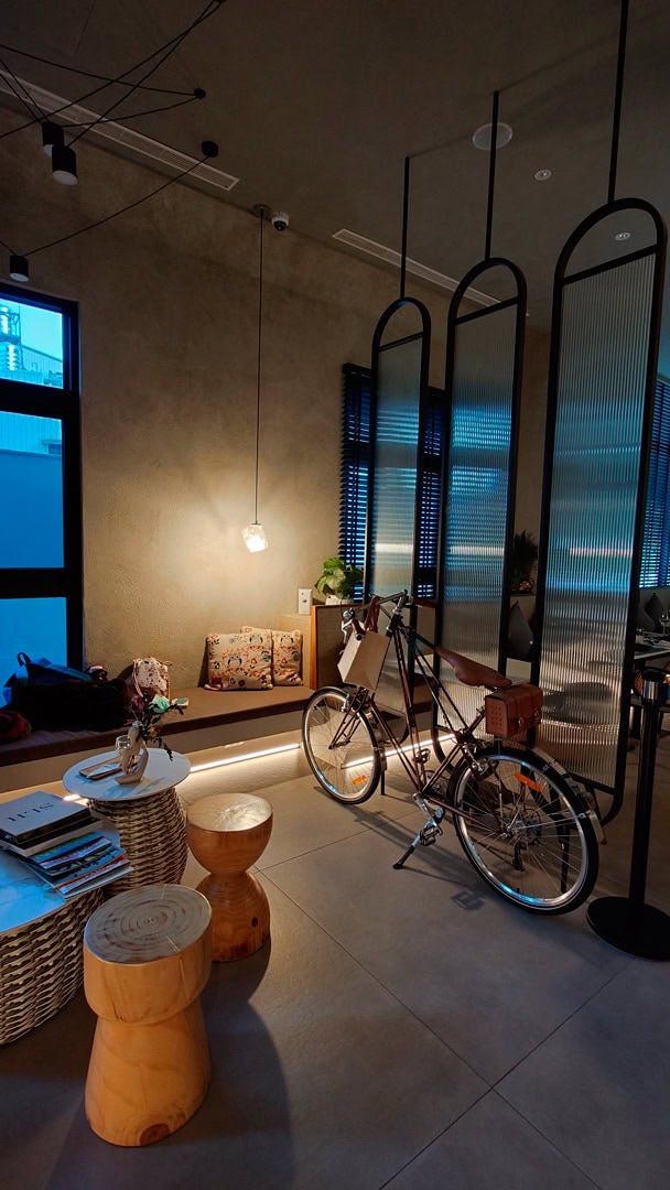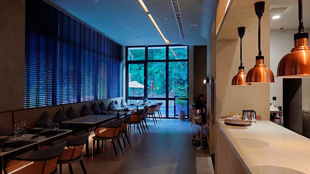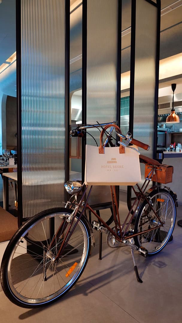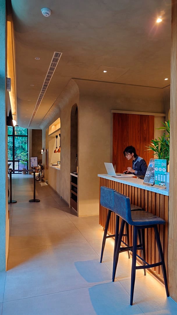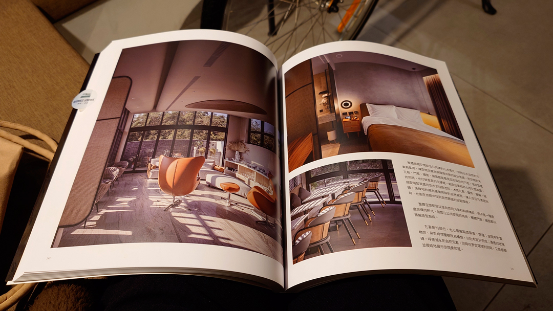 旅宿本身曾獲多項設計大獎,入口並非直接臨大馬路,而是需穿過一段被樹籬與光影包圍的小徑,從左側進入。推門而入,接待客廳燈光溫暖柔和,後方即是餐廳空間。入住時也貼心準備了迎賓點心,當天是蜂蜜檸檬氣泡飲與乳酪酥餅;迎賓廳桌上陳列著介紹歸璞泊旅得獎設計的雜誌,讓人一邊品嚐點心、一邊慢慢進入這趟旅程的節奏。