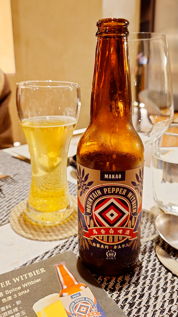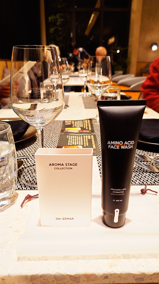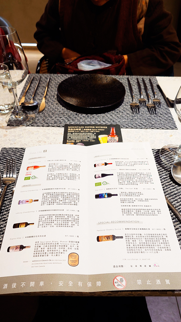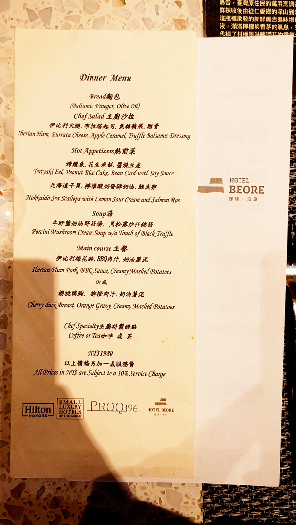 晚宴於六點開始,整齊的餐桌已擺放好菜單。由於香魚1月生日,預約壽星方案而享有贈禮:Der ZÖMAR 日暮靜海淡香精與黑晶焠舒潤潔顏乳,正是歸璞泊旅客房盥洗用品所使用的品牌。此外,還附贈一瓶來自草屯蔡氏釀酒廠的精釀啤酒,可選擇烏梅或馬告風味。原本本能地想選擇最愛的烏梅,但又對馬告感到好奇,最後決定嘗試馬告。入口後果然清爽宜人,與富含奶油與乳酪香氣的法式料理搭配得恰到好處。