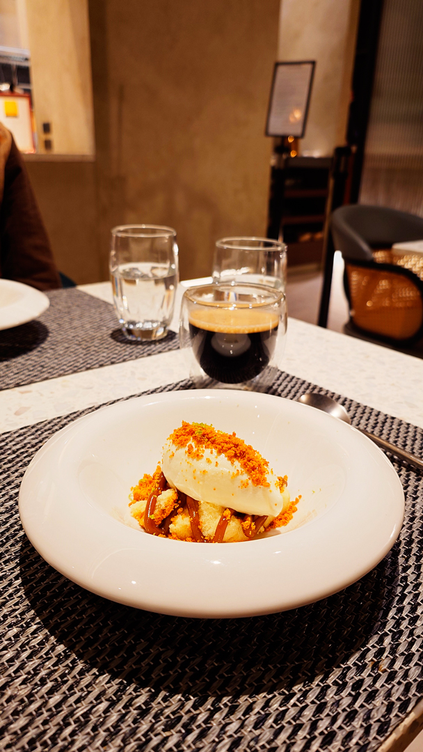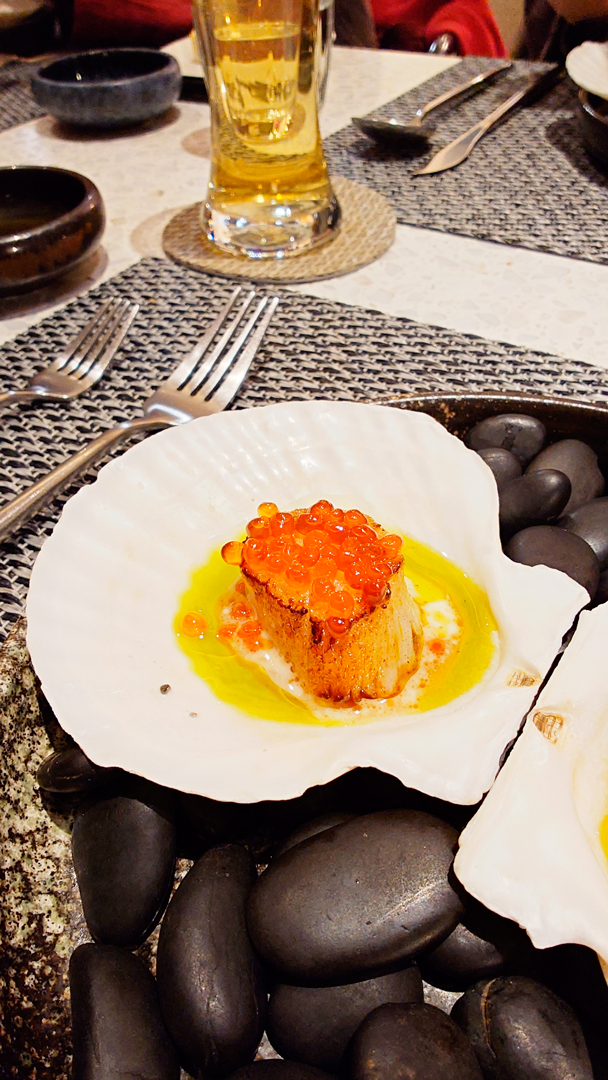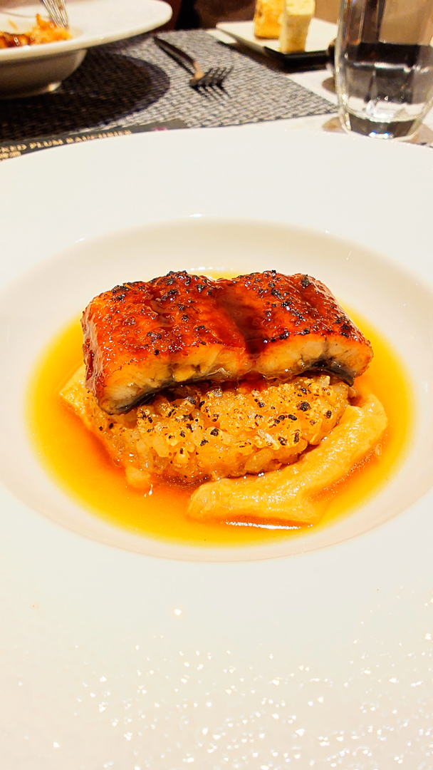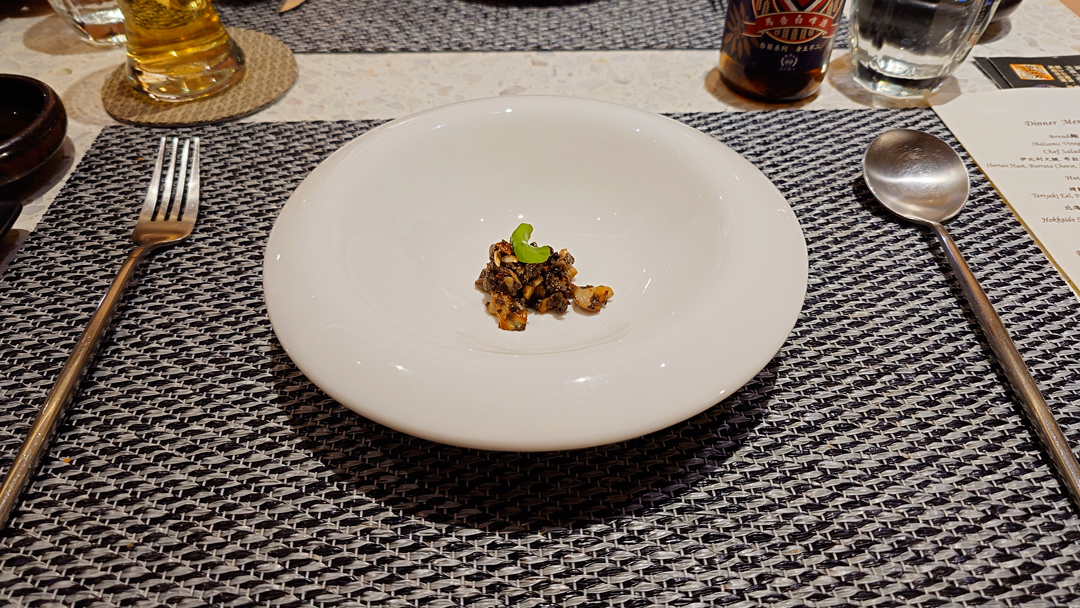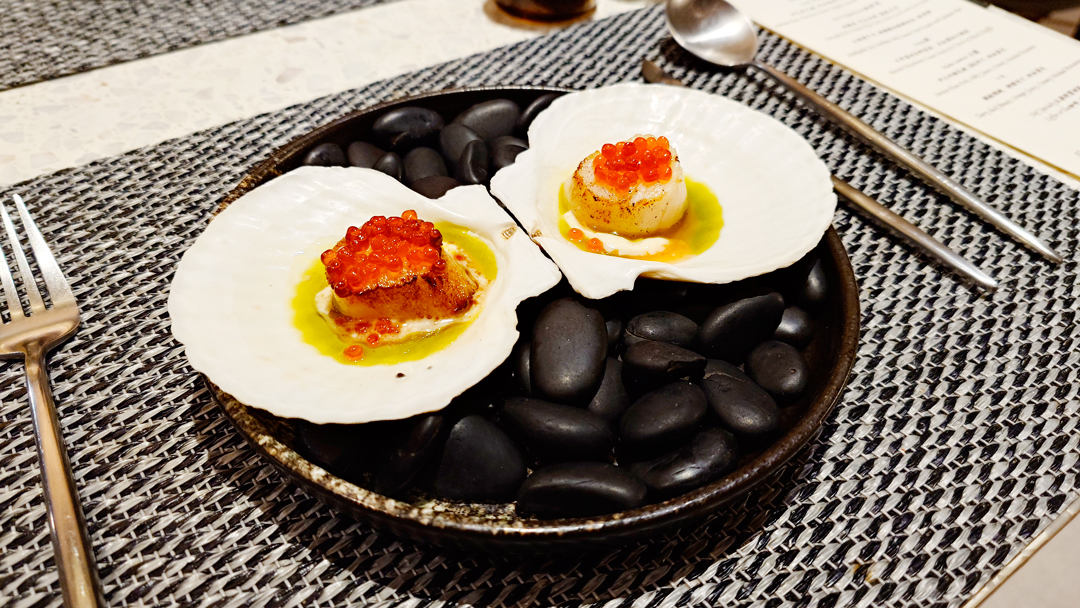 創意熱前菜「鰻魚豆皮鍋巴飯」,為西式套餐注入中式靈魂,醬燒風味讓整體口感多了一份溫暖而厚實的重量感;另一道熱前菜為干貝佐鮭魚卵,搭配奶油與橄欖油醬汁,清爽中帶著豐腴,展現日西交融的巧思。