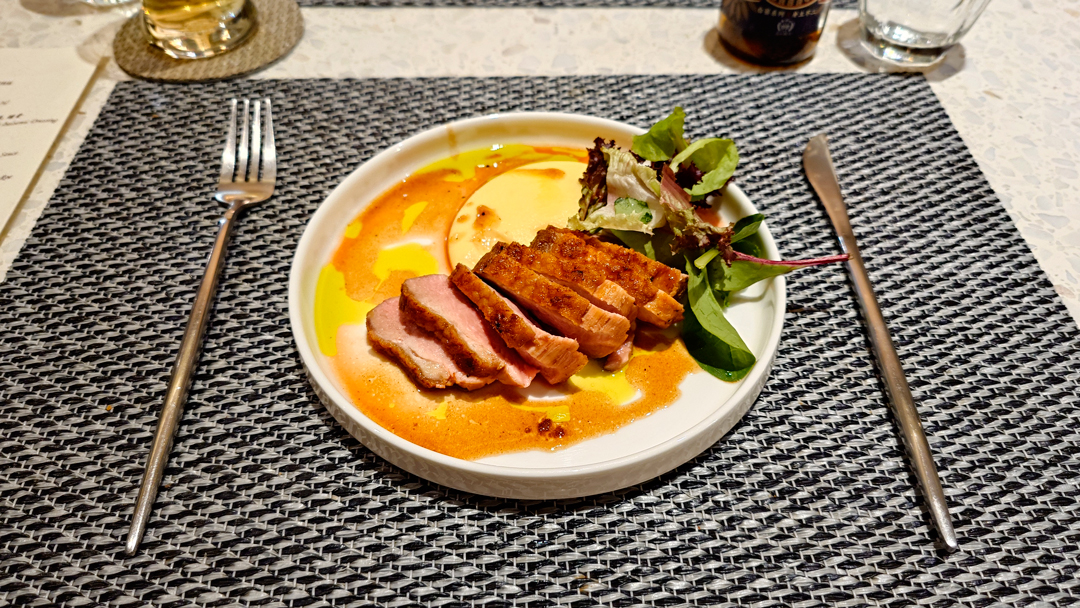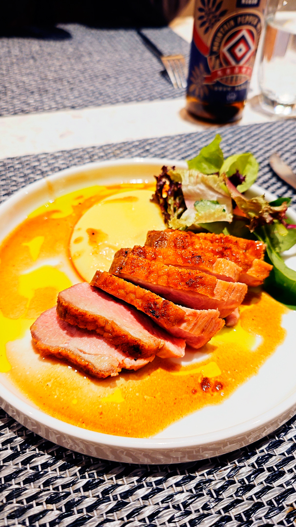 主菜部分,除了菜單上的櫻桃鴨胸與伊比利豬,也可加價選擇兩款牛排。鴨胸與伊比利豬都相當軟嫩,盤底佐以橄欖油與醬料,簡單卻耐吃。