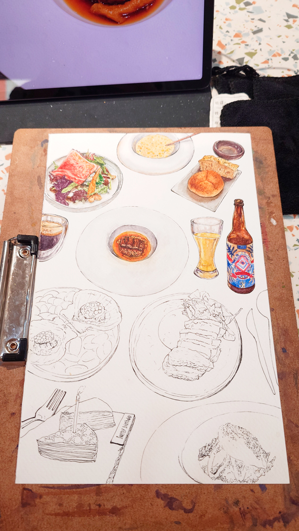回到創作,我將這次的餐點以代針筆描繪,再以水彩上色;背景選用餐廳桌面的石材紋路,每一道料理旁標註其英文名稱。細緻的線條與色彩,成為我記錄這段美好體驗的方式。有次上色時在中興新村地方創生育成商店值班,作品尚未完成就被顧客看到,對方竟然立刻表示想要下訂,真的讓人又驚又喜!