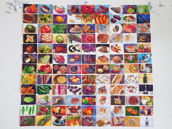 應禾木咖啡之邀,繼上次在 Cafe Arena 展出的草屯、中興的在地美食,這次在改成展出異地的美食作品。為了與禾木咖啡的空間有良好搭配,此次展覽選擇展出小於A5的迷你作品,也是前兩次展覽從未展出過的。主題之所以訂為「輕旅行」,是因展出的畫作中,包含了在英國留學時嘗過而印象深刻的美食;還有一張8開的「蘇格蘭蛋糕桌」,蘊含了滿滿的愛丁堡旅遊回憶。